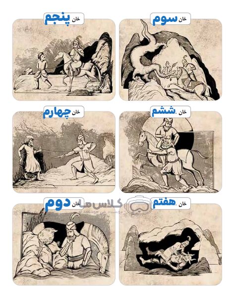 ۲- هر یک از تصاویر زیر، مربوط به کدام خان از هفت خان رستم است؟