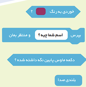 دستورات این گروه برای دریافت اطلاعات از کاربر، تشخیص فشردن دکمهای از صفحه کلید، کلیک کردن، و یا برای تشخیص برخورد یک شکلک یا ماوس با لبههای صفحه و یا یک شکلک دیگر استفاده میشود. این دستورات به رنگ آبی روشن هستند. در شکل ۱۲ برخی از دستورات گروه تشخیص نشان داده شده است.