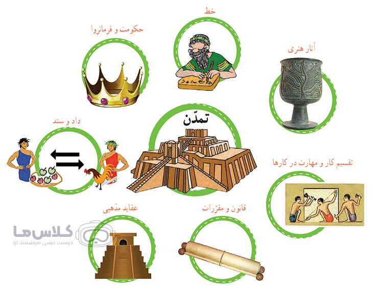 با پیدایش شهرهای بزرگ، کم‌کم تمدن‌های بزرگ به وجود آمدند. این شهرها ویژگی‌هایی داشتند. این ویژگی‌ها را در تصویر زیر مشاهده می‌کنید.