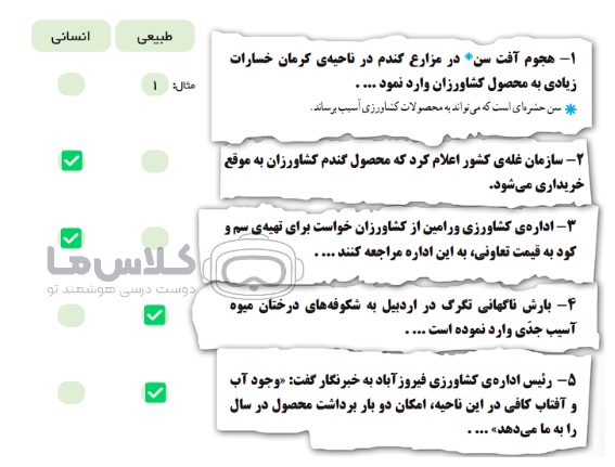 این اخبار از روزنامه ها برداشته شده است. هر یک از آنها به کدام عوامل مؤثر بر کشاورزی مربوط است، طبیعی یا انسانی؟