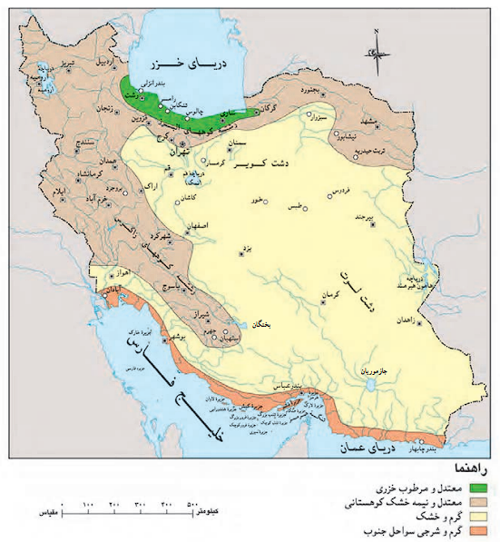 در کشور ما نواحی مختلف آب و هوایی پدید آمده است. بعضی از این نواحی تفاوت بسیار زیادی با هم دارند. بعضی از اقلیمشناسان* معتقدند بهطورکلی ایران را میتوان به چهار ناحیهی آب و هوایی تقسیم نمود: