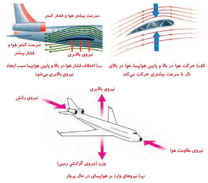 بال‌های هواپیما را به گونه‌ای طراحی می‌کنند که وقتی هواپیما در حال حرکت است، هوای بالای بال نسبت به هوای پایین بال سرعت بیشتری داشته باشد. همین امر مانند آزمایش نوار کاغذی، سبب اختلاف فشار در بالا و پایین بال و ایجاد نیرویی به‌طرف بالا می‌شود. اگر نیروهای رو به بالا از نیروی جاذبه‌ی وارد بر هواپیما بیشتر باشد، هواپیما را به طرف بالا می‌کشد. پس به هواپیمای در حال حرکت علاوه بر نیروی جاذبه‌ی زمین، مقاومت هوا و نیروی رانش، نیروی رو به بالایی نیز وارد می‌شود که اصطلاحاً به آن نیروی بالابری گفته می‌شود.