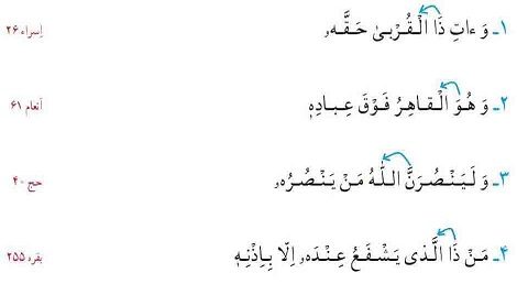 این جملههای قرآنی را بخوانید و دور حرکتی که هنگام وقف خوانده نمیشود، خط بکشید.